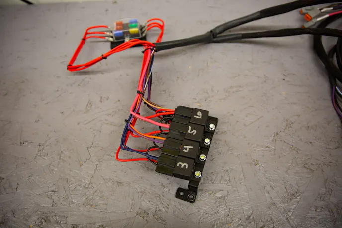“With some applications, we use Delphi Mil-Spec connectors at the firewall pass-through. For abrasion resistance and looks, we utilize expandable mesh sleeving, too,” McDonald adds. “All power and ground connections for the harness are routed back to the battery, requiring one battery positive and one battery negative connection. We utilize premium high-amp automotive relays in our relay block for proper power control, and each circuit is properly fused in a single fuse block. Terminations for the switch panel are made so that you can run any of our available vehicle-specific switch panels.