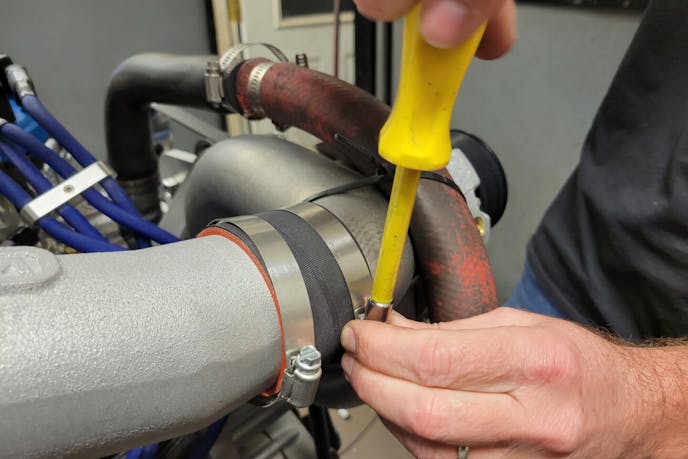 “Anytime you’re under the hood, check the oil lines for kinks or cuts, check hoses and tubes for leaks, and check the clamps for tightness,” says Martz. “Check for impeller contact to the volute and/or debris, check the impeller for damage — visually inspect it any time you have the filter or inlet off. Typically, if you run a filter on it at all times, you won’t see any issues.”