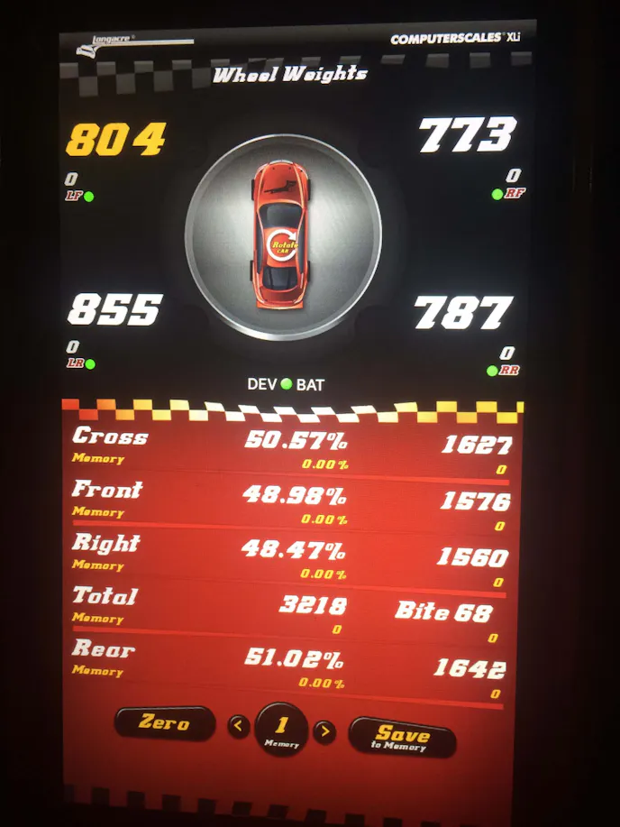 Scaling the car has also been extremely important. We rolled into the first race 115 pounds under weight. We added the weight to make the race, but in the process, found where the car was unbalanced. The split front to rear is good, but the left/right splits required some weight to be moved around. This weight placement will allow us to balance the car so it goes perfectly straight every pass.