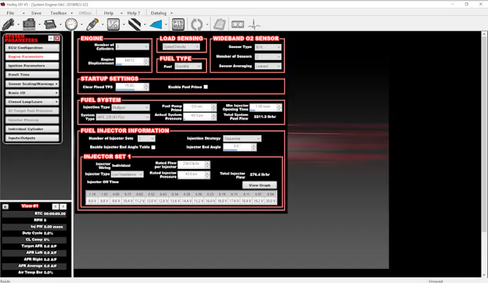 One of the first tasks we confronted when configuring the computer was telling it what kind of engine it would be controlling. Most of this configuration is handled in the “Engine Parameters” screen, and the interface of the software really did make this relatively simple. Some of the more complex settings, like “Load Sensing” relate to how the car will be tuned. This is primarily based on tuner preference. In this case, we chose “Speed Density” to tune the car based on our MAP (Mass Air Pressure) readings in relation to engine RPM. Tuning this way would allow us to set a desired fuel number (in pounds-per-hour or volumetric efficiency) at any point in the engine RPM curve.
