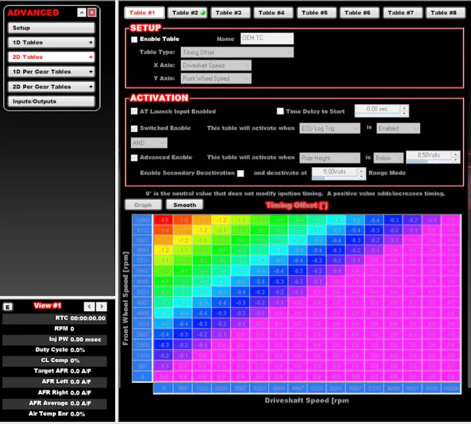 - Want to drop timing after a certain time threshold but only if ride height is above X inches and the TPS is above Y%? Advanced tables have got your back.
