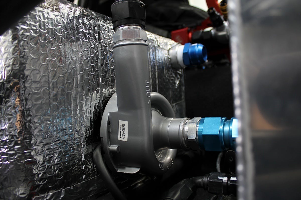 The EWP150 pump offered by Davies Craig is a universal-fit water pump that’s powered by the car’s electrical system, and are designed to eliminate heat soak and provide better temperature control, critical in our application. Since the pump is wired into our switch panel, operation is easy — and we can turn it on with the car not running to circulate the water/ice mixture throughout the system. The 150 liter-per-minute flow (40 gallons per minute) the pump offers is paramount to the system’s performance, and it’s more effective with any kind of backpressure.