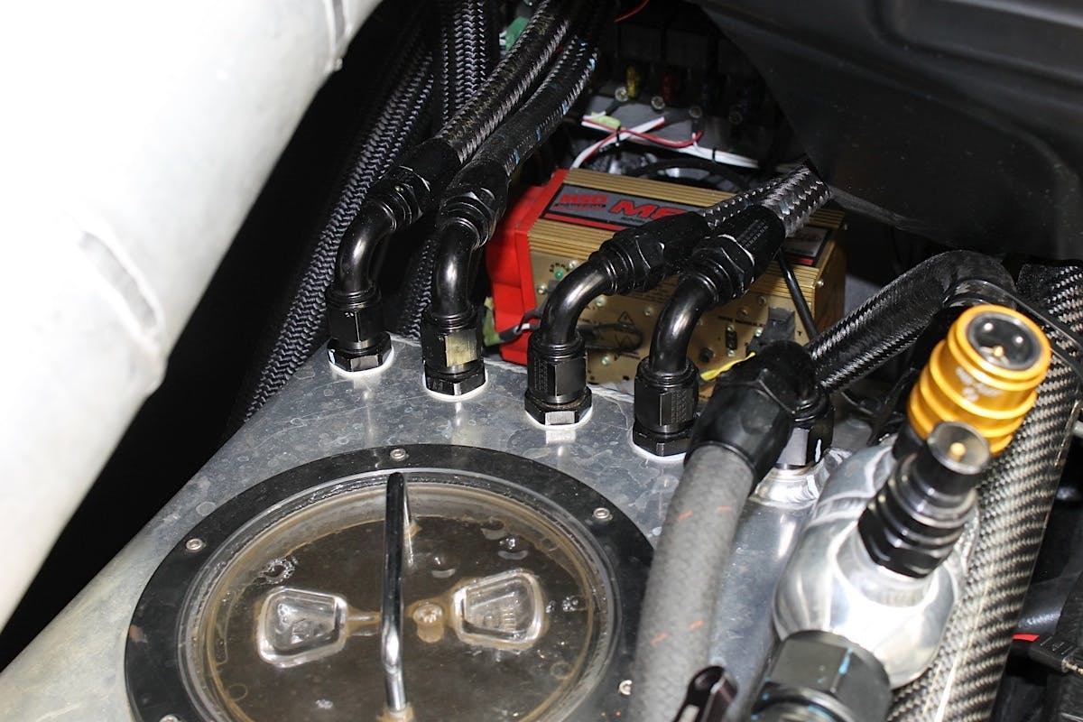 In order to plumb the water system, we turned to Russell Performance and Peterson Fluid Systems to do so. Russell set us up with some of their ProClassic II -16AN, -10AN and -06AN nylon fiber braided hose along with the correct fittings we required to get the water from our in-car cooling tank to the engine and back again. Peterson’s billet five-way manifolds and Y-blocks made the process simple, even though it might sound complex.