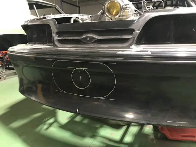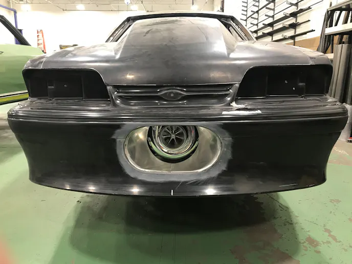Engling mounted the new nose, and got to work fabricating a very clean-looking inlet in the bumper that transitioned down to the size of the supercharger volute.