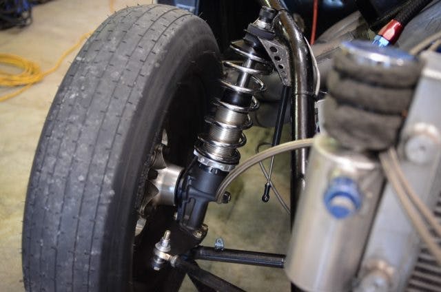 “We tested at Ohio Valley Dragway with the car and were pleased with the results. Our first run we allowed the strut to fully drop out. Because the track was so good and the car hit the wheelie bars so hard, we stiffened the extension on the front struts through two more passes to the extent that the front wheels were only dropping out 3/8-inch before the front end touched back down. This showcases much control these struts provide,” Saffell explains.