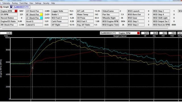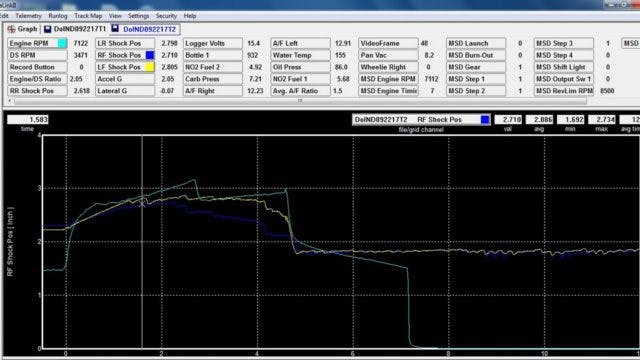 In this screenshot from the Racepak that was taken on the first run with the new struts, the green (shock movement) and red trace (engine RPM) lines represent the front struts moving when the car launches. This shows the struts are able to quickly extend when O’Neal releases the transbrake at the start of the run. Since this run was made during the heat of the day and on a marginal track, the goal was to get the weight to transfer as quickly as possible for a baseline to make more adjustments.