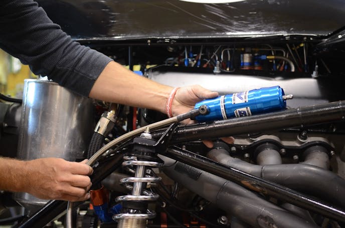 “We tested at Ohio Valley Dragway with the car and were pleased with the results. Our first run we allowed the strut to fully drop out. Because the track was so good and the car hit the wheelie bars so hard, we stiffened the extension on the front struts through two more passes to the extent that the front wheels were only dropping out 3/8-inch before the front end touched back down. This showcases much control these struts provide,” Saffell explains.