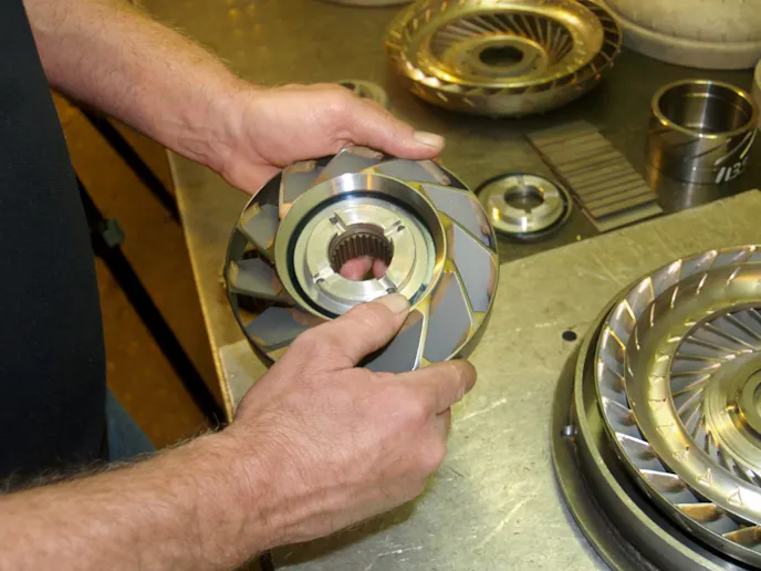 The impeller pump has the job of beginning the fluid flow and pumping the standing fluid through the converter. “The impeller is the pump side of the torque converter, and it typically has a hub in the center that engages the transmission pump. The impeller rotates at engine speed and is responsible for pumping fluid throughout the converter,”  Winstead explains.
