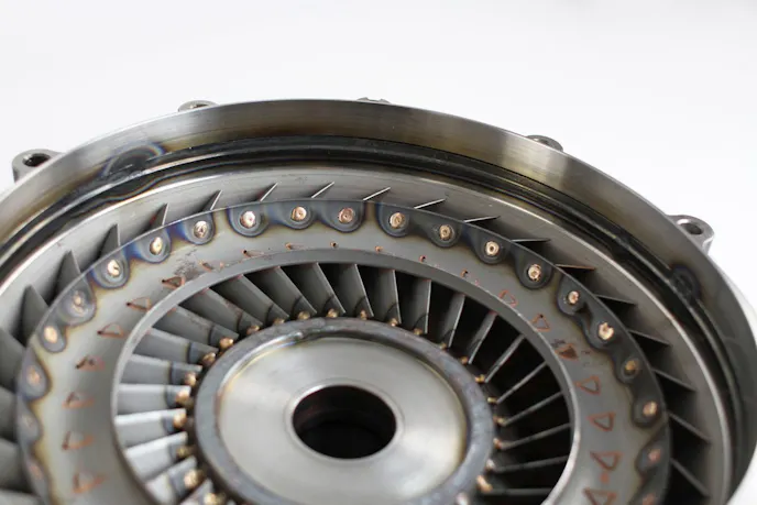 If the stator is the brains of the converter, the turbine is the brawn of the operation. As the fluid flows from the stator, it hits the turbine and rotates it. Since the turbine is connected to the input shaft of the transmission, it results in the car moving as it rotates. Caine points out that the turbine must be designed correctly to function in the converter. “There is no real magic in the turbine other than using quality material and furnace brazing the fins for longevity,” he says.