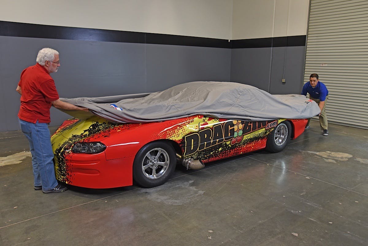 This custom service is invaluable to the automotive enthusiast. After all, just because you started with a stock vehicle it doesn’t mean the dimensions of the body shape are the same once all of your modifications been performed. We chose two perfect examples of this–a custom 1935 Ford Coupe, and the Dragzine Chevrolet Camaro NMCA Street Outlaws class “BlownZ” dragster, to demonstrate the measuring process involved in ordering a custom car cover from Covercraft.