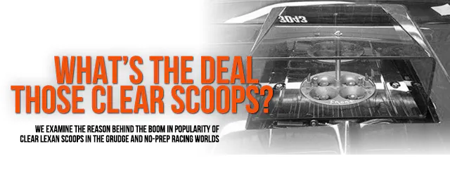 We can address most of the “who” right off the bat, as it seems that probably 9 out of 10 lexan scoops are on grudge, no-time and no-prep cars, the current outlaws of the sport, it seems. While there are some X275 cars beginning to adopt the see-through design, and Radial vs the World competitor Chad Henderson has utilized one on his big-inch nitrous Grand National for a few years, the vast majority of them are used in the grudge and N/T world. Lately, the explosion of no-prep events has opened a new market for the clear scoop as well.