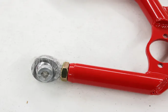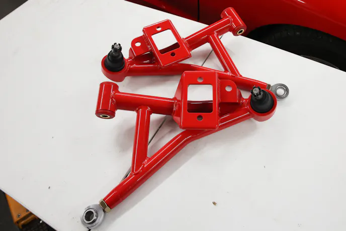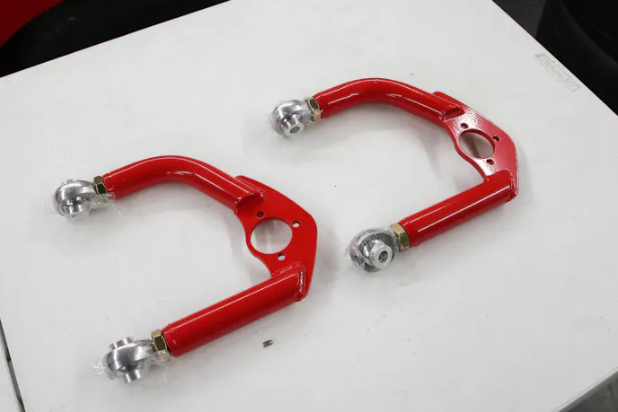 The OEM A-arms that were still being used on Project Number Cruncher needed to go since they are heavy and lack any adjustments. By moving away from the OEM units, we are able to jettison some weight and make it easier to put a precise font-end alignment on the car.