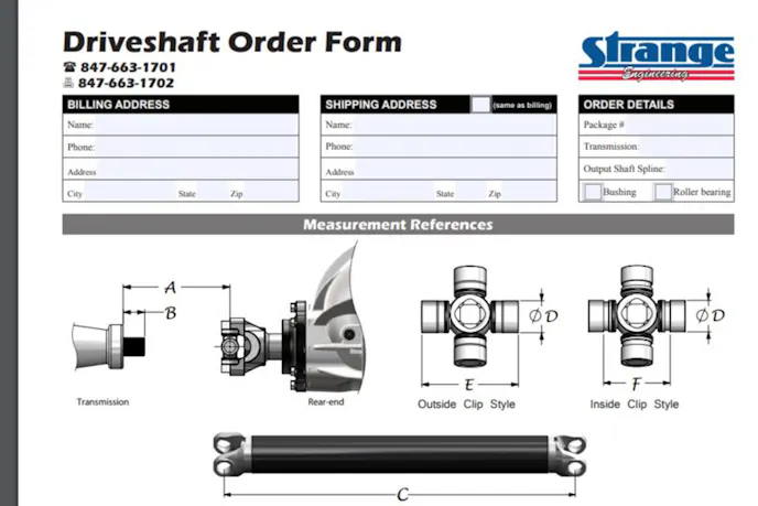 A driveshaft isn’t going to be a one-size-fits all type of part — chances are your specific application will need a custom driveshaft. Strange has made the process of ordering a custom part simple by providing customers with an easy-to-use order form, with illustrations that show where you need to measure and provides the dimension definitions to answer any questions you might have.