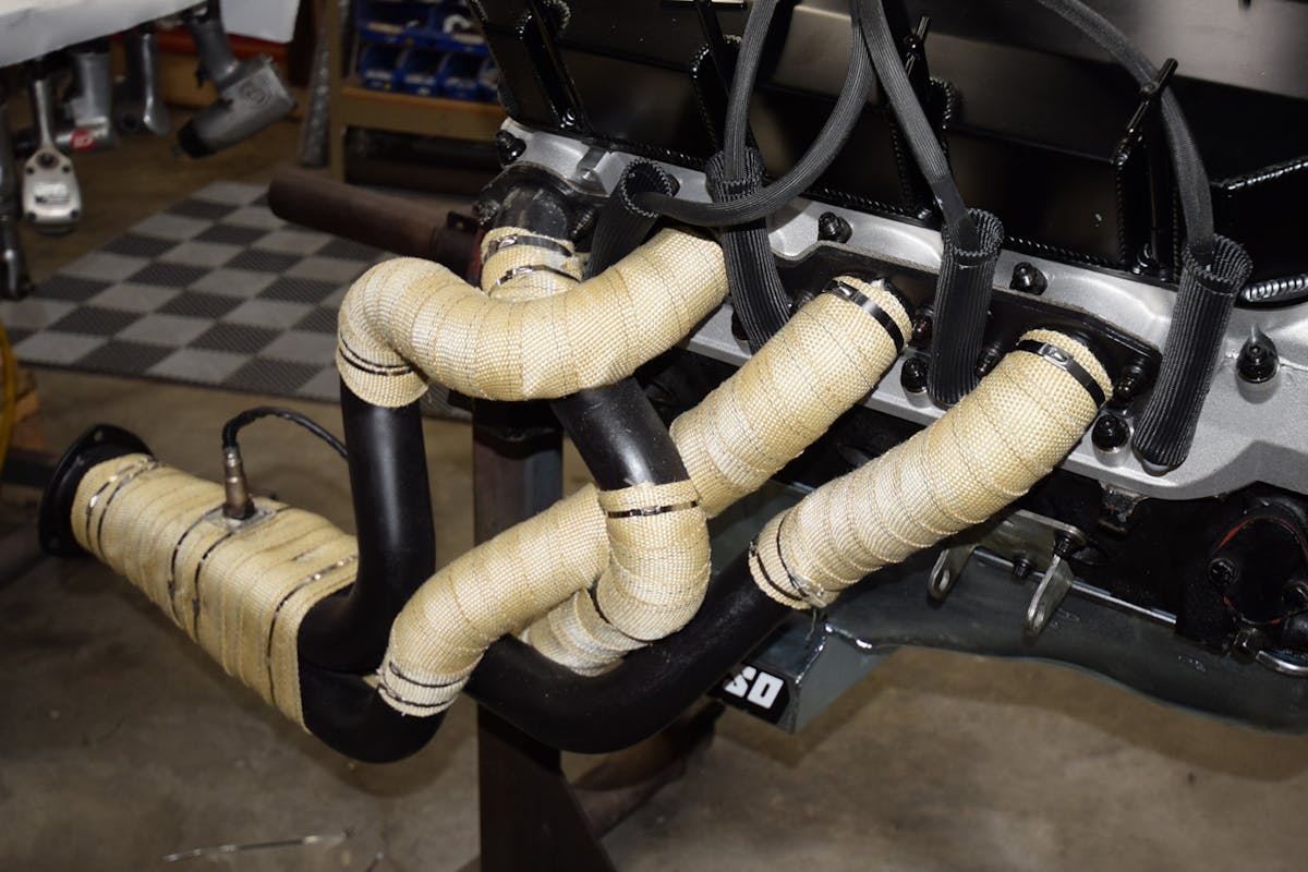 After the first couple of tubes were wrapped, we were beginning to get the hang of it. Our priority was to cover each tube to protect such adjacent hardware as our starter, ignition wires, oil filter, and fuel system as much as possible. This will also allow us to work around the engine during the battles of race day while minimizing “hot headers” for the crew.