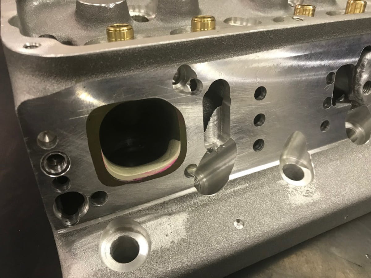 “The head as sold from INDY comes with a 235cc intake port, a 105cc exhaust, and a 69cc chamber. So a tremendous amount of welding was necessary to get the material needed to have full clean up with the intended port design. Working with a third head casting as a model and lots of epoxy, once a satisfactory intake port, exhaust port, and chamber were hand finished, the necessary data was taken to compose a CNC program to port what would become the actual race heads,” Kieffer explains.