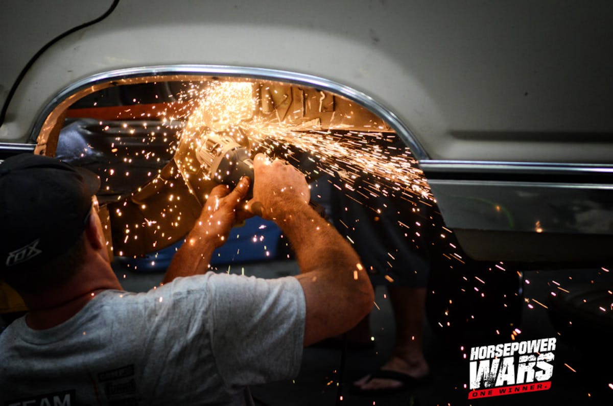 As sparks fly and the floor of the Horsepower Wars set becomes ever-more littered with factory steel, wiring harnesses, seats, and other discarded parts and pieces, the Horsepower Wars tech staff is getting down to its own business of ensuring fair play among the teams. This season, Lonnie Grim, the PDRA’s Competition & Technical Director, was brought in to join the $10K Drag Shootout technical team. Grim is one of the sport’s most respected tech inspectors and rulesmakers, and armed with a lifetime of experience around the sport, you’ll be hard-pressed to sneak a fast one by him, as the teams quickly discovered.