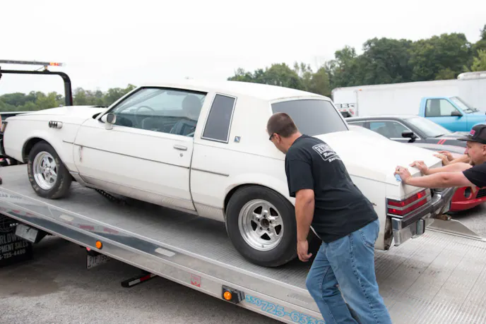 Team Boddie was the second to arrive after their flight from the west coast; they gave the G-Boddie a quick inspection to see how it fared during the trip. The car did have a few extra dings, but appeared to be in functioning order. Since the team didn’t have a way to transport the car to the track, they called on AAA to haul the Regal. A big test for the G-Boddie was if it would actually move forward under its own power after it wouldn’t on the last day of the build. When the big Chevy engine was fired up, the team was able to drive it onto the rollback without any issues.