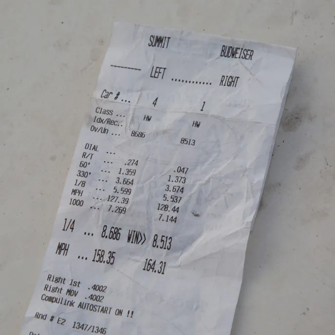 The first qualifying session for Team Stinky Pinky and Dr. Rod Knocker raised more questions than the team was ready for. As the car rocketed down the track, there was an obvious issue with the front suspension as the wheels chattered back and forth. It was later discovered that the root cause of this was a set of bad ball joints. The pass was ultimately cut short when the burst panel on the intake manifold blew out when the car hit the rev limiter that was set too low. 12.29 at 74.1 mph was the first hit.