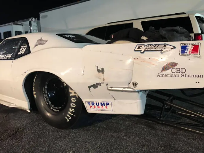 In the opening round of eliminations, Merick and Phillips were racing alongside one another in the left and right lanes, respectively, when Merick’s 1979 Corvette crossed the centerline and struck the driver’s side of Phillips’ 1968 Camaro; the unintended contact sent Phillips and his “Big Nasty” machine up on two wheels as he put his driving talents to work to save his racecar. Merick, meanwhile, was putting on a show of his own, as the Corvette spun more than one full revolution and slid to a stop in Phillips’ lane. Amazingly, despite the contact at such a high-acceleration part of the run, neither driver so much as scraped a guardrail and each incurred only minor body damage. Phillips, the winner by way of the first-or-worst rule, returned in the next round but fell to Frankie Taylor.