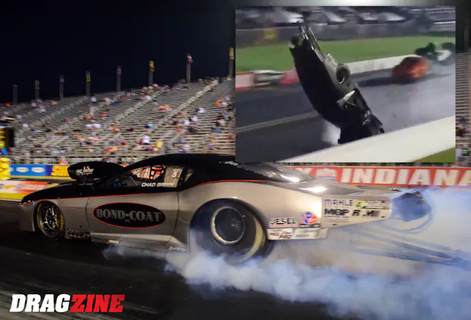 In case you missed it, Pro Modified competitor Chad Green was injured in a frightening high-speed crash during the final session of qualifying for the U.S. Nationals on Sunday evening. In the first pair out and running opposite of Jose Gonzalez on a do-or-die run to get into the record-breaking field, Green lost control of his Pat Musi-powered, nitrous-assisted Camaro and somersaulted, crashing back to earth on all four wheels.