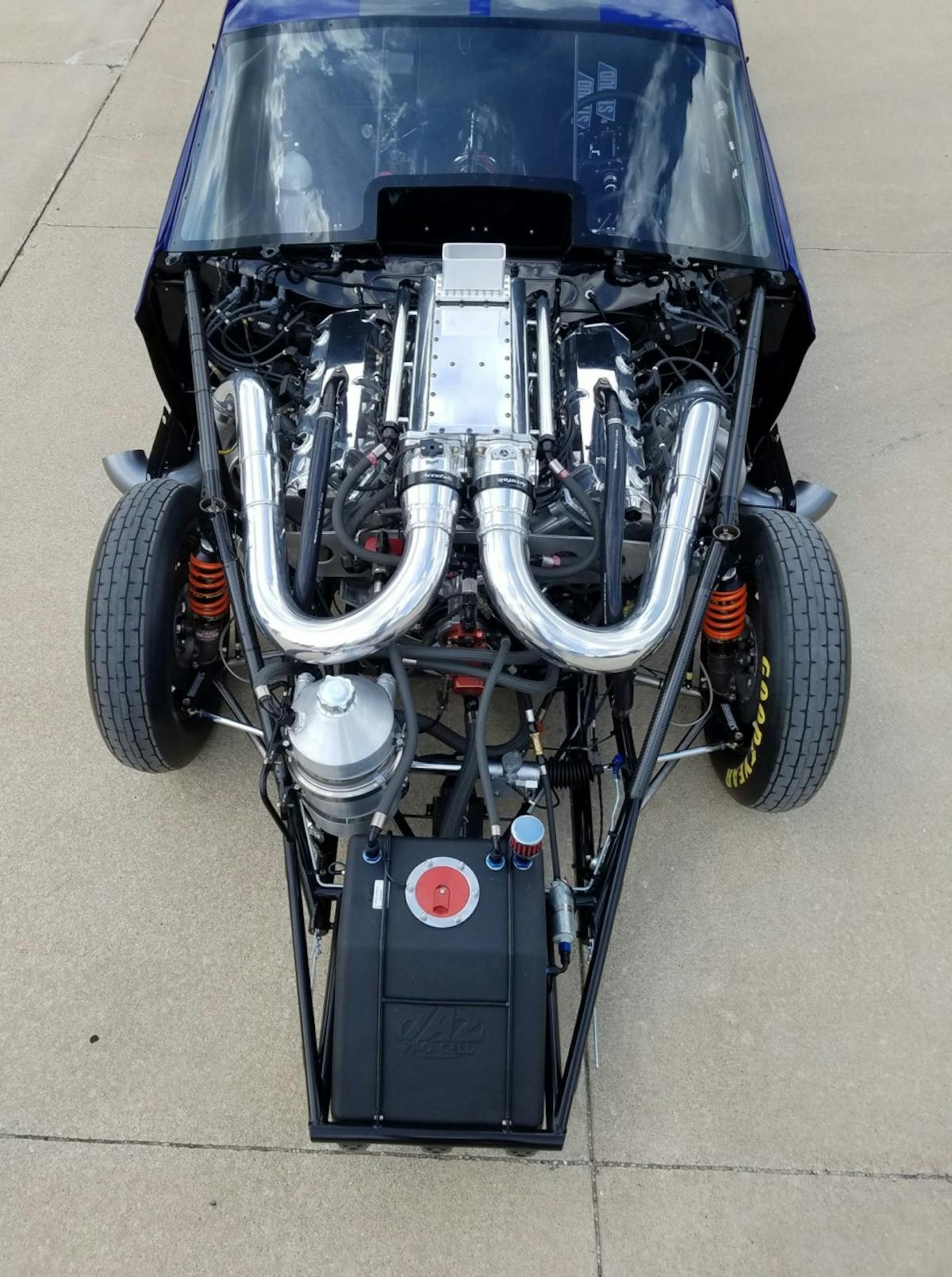 The all-carbon-fiber body is painted Ford Sonic Blue which looks absolutely killer, and the full-tube chromoly double framerail chassis is capable of handling well over 4,000 horsepower! Inside is a full carbon-fiber interior with a custom carbon-fiber wrap around seat and a Butler seat insert and safety head pad with a Stroud 6-point camlock harness.
