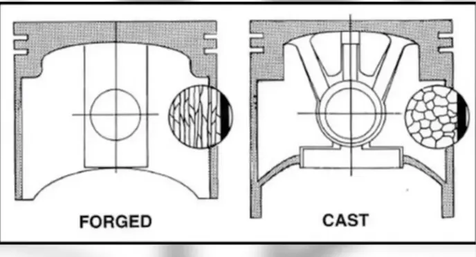 The biggest difference between cast and forged pistons is how they’re made. Cast pistons are created by taking molten aluminum and pouring it into a mold to form the piston. Forged pistons start life as a solid piece of aluminum and are heated, then formed into shape via compressive force in a press.