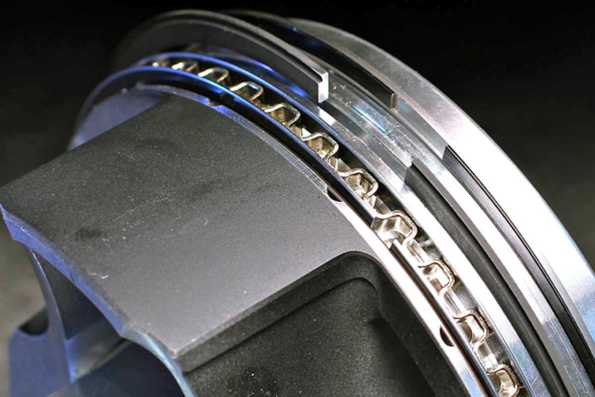 The rings in the bottom piston groove, which are commonly seen as a three piece design, are responsible for scraping the oil from the cylinder walls, helping to regulate oil consumption. This ring assembly itself commonly includes two thin outer steel “rails” and an inner expansion ring/spacer, tasked with the job of holding the outer rails at the correct axial distance while also pressing them outwards against the cylinder walls to scrape the oil away.
